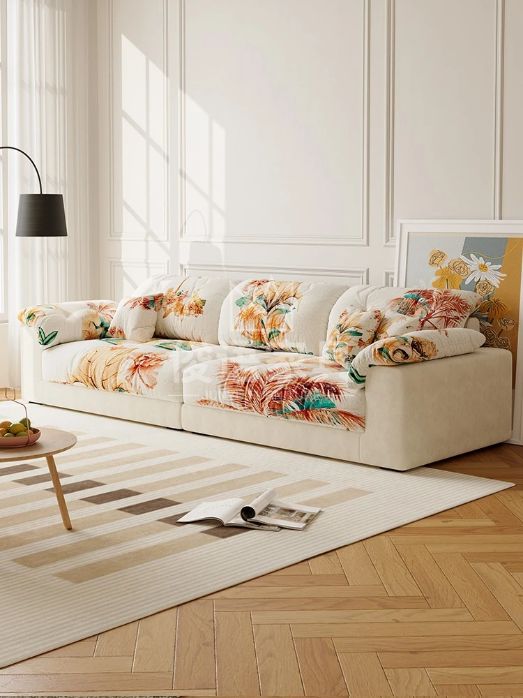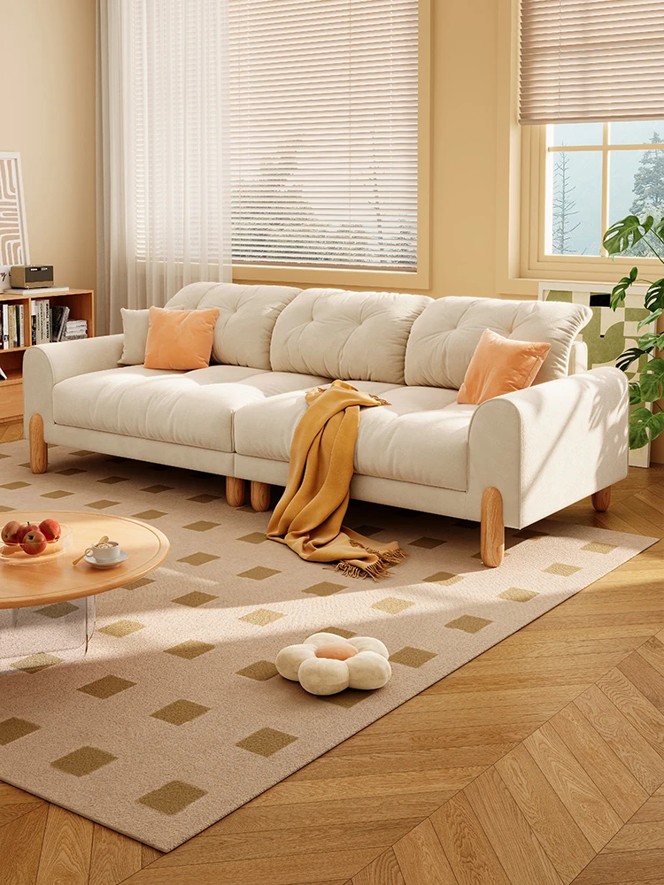 フレンチビンテージスタイルの雲朵ファブリックソファ - 小型リビングに最適!2025年新作、シンプルでおしゃれな直線デザインの無垢材ソファ。あなたの空間に優雅さと温もりをプラス!