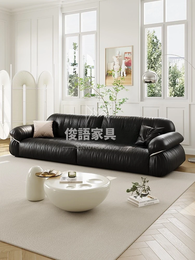 イタリアンミニマリズムの象耳デザイン!本革製モダンラグジュアリーリビング用ブラックダウンストレートソファ、2025年新作登場!快適さとスタイルを両立した一品をお見逃しなく!