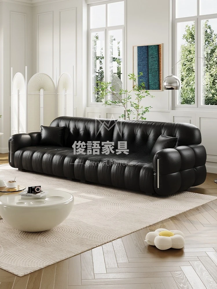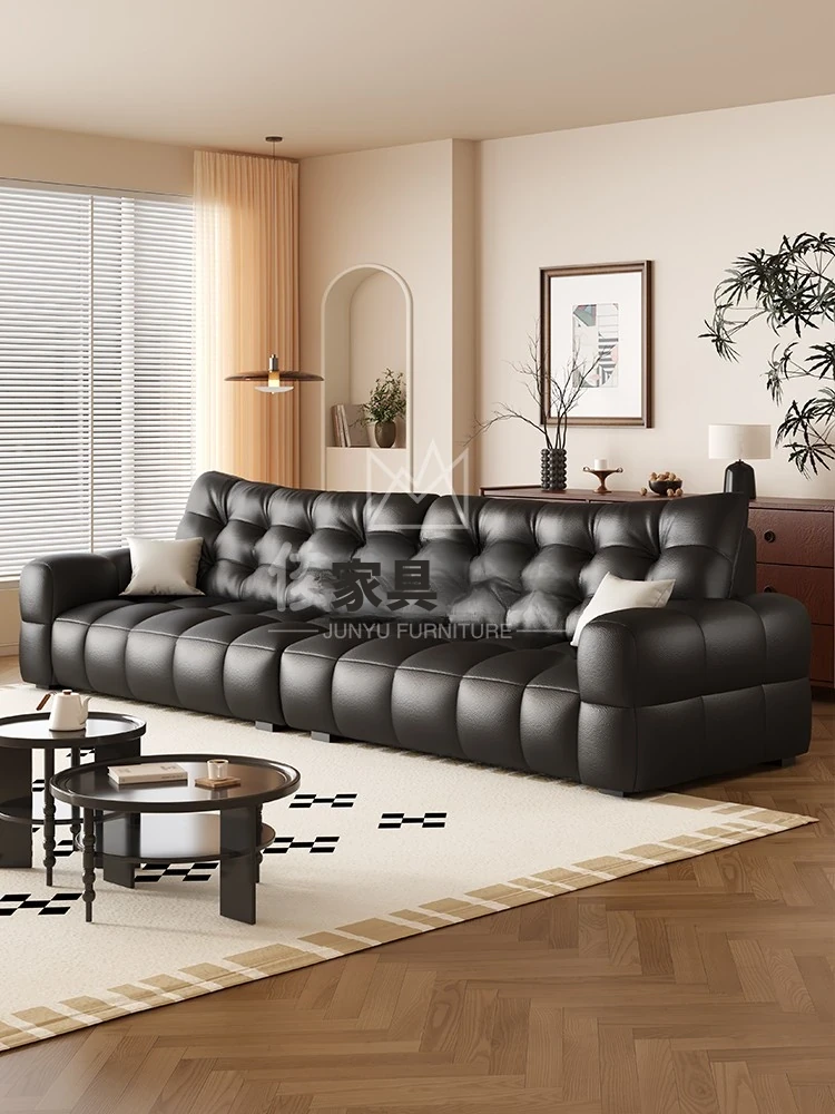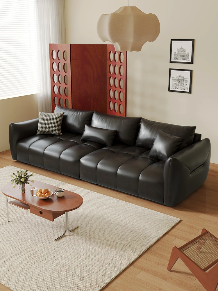 2025年新作!レトロなオイルワックスレザーソファ、モダンでシンプルなデザイン。コンパクトなリビングにも最適、高級感あふれるブラックストレートソファで、あなたの空間をスタイリッシュに演出!