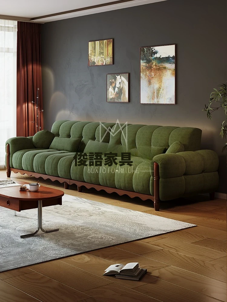フレンチビンテージスタイルのリビング用グランドピアノキーソファー!小型住宅にぴったりのストレートデザイン、天然木製でレトログリーンの布地を使用した中古風ソファ。おしゃれで快適な空間を演出します!