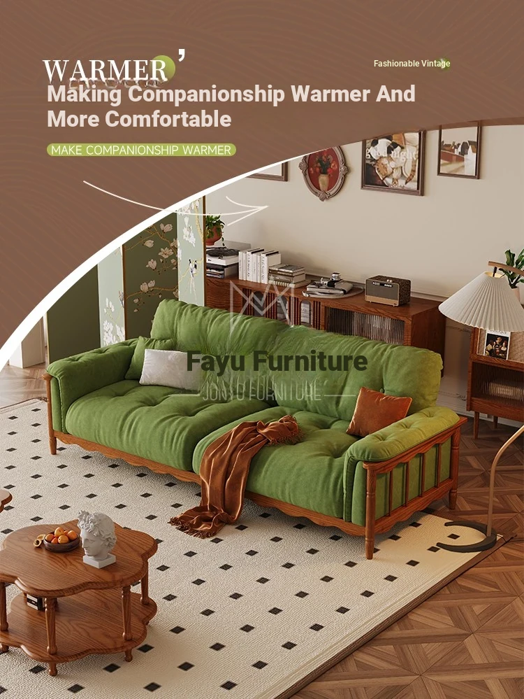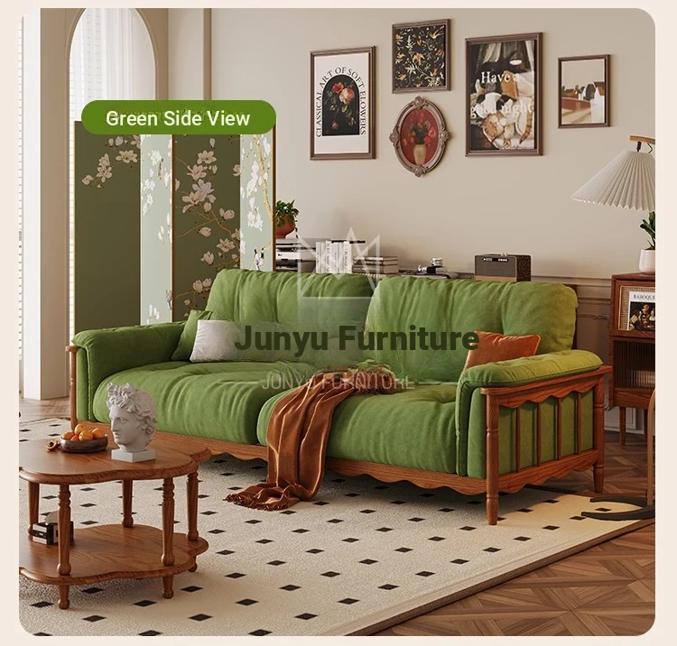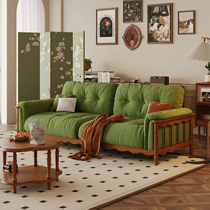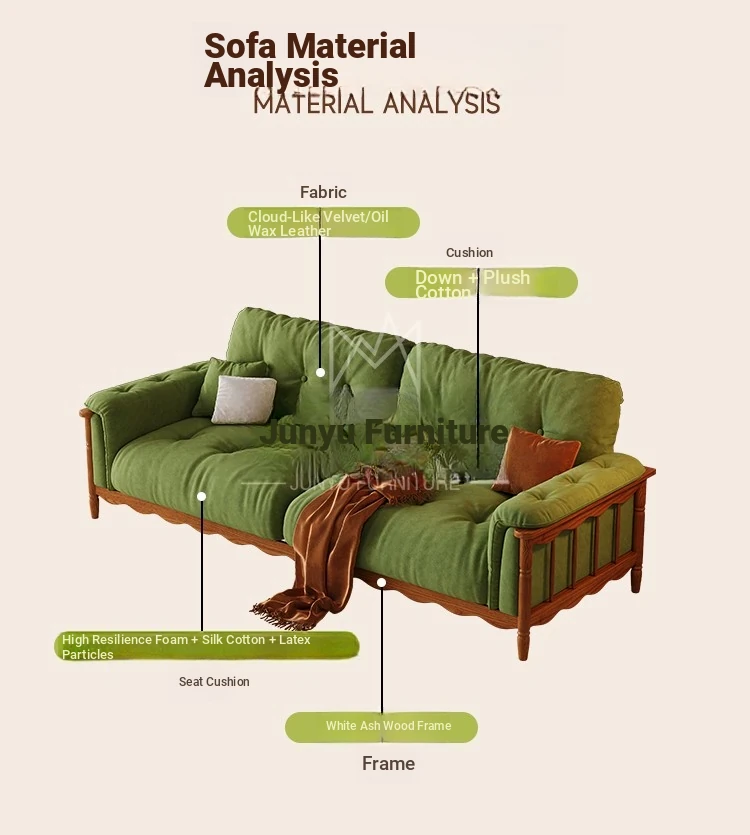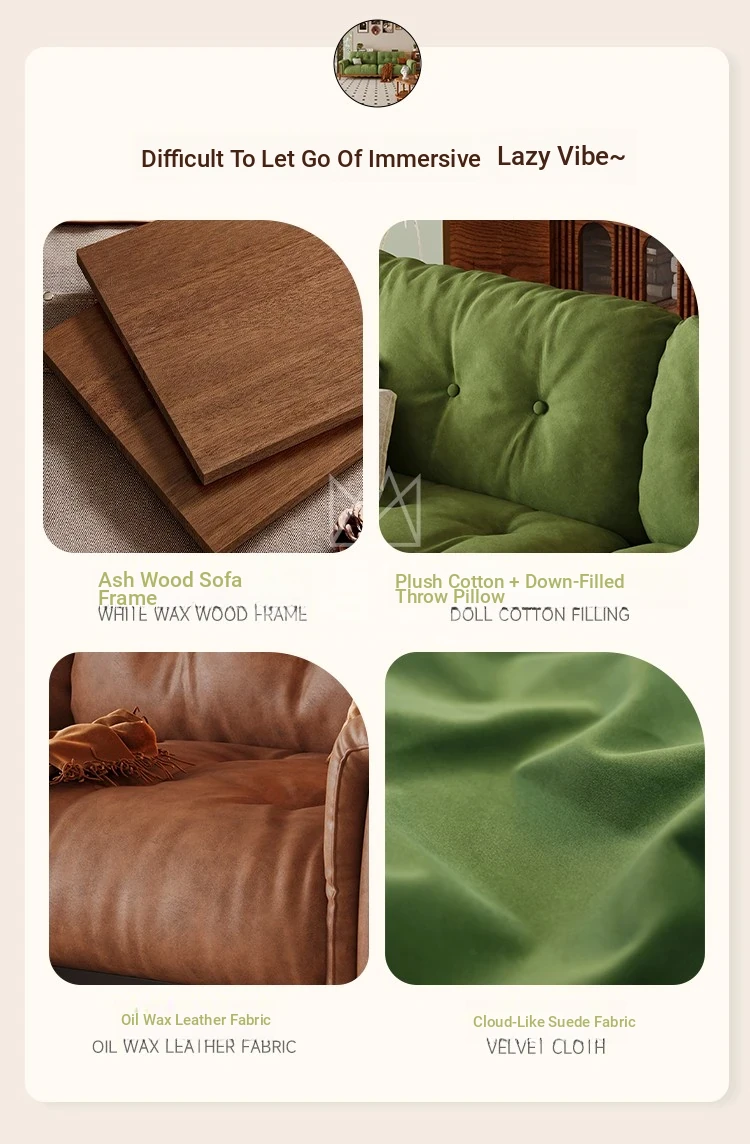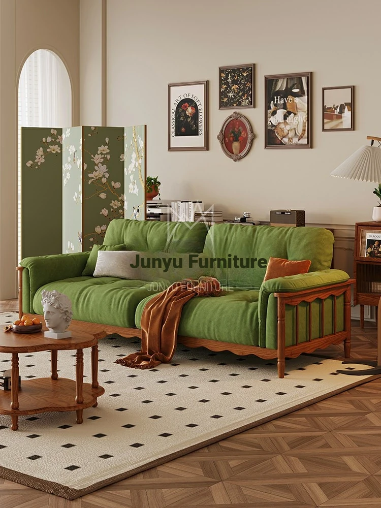 French Vintage Solid Wood Cloud Velvet Sofa for Small Living Rooms - Stylish and Cozy Oil Wax Leather Design, Perfect for Compact Spaces!