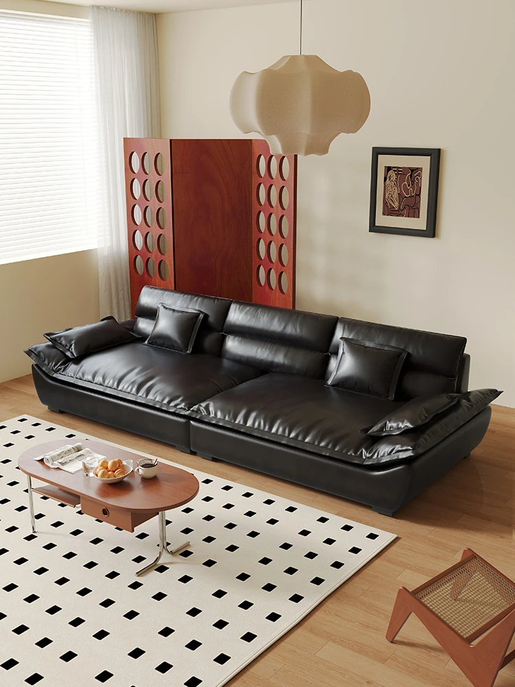 2025年新作!レトロなオイルワックスレザーソファ、モダンでシンプルなデザイン。コンパクトなリビングにも最適、高級感あふれるブラックストレートソファで、あなたの空間をスタイリッシュに演出!